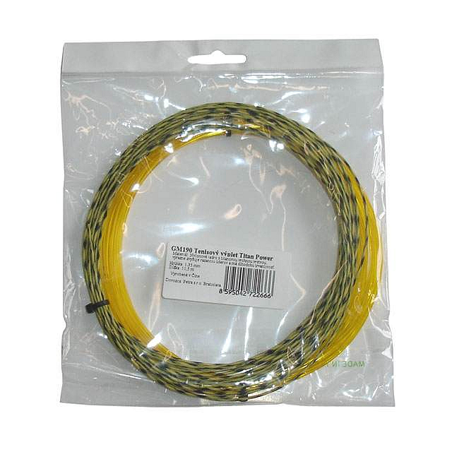 Tenisový výplet Titan Power v délce 11,5 m. Tenisový výplet Titan Power 1,35 mm. Titan Power je tužší ale velmi odolný výplet, který vydrží v raketě mnohem déle než běžné výplety. Délka výpletu je vhodná pro všechny velikosti hlavy rakety do 115 sq. inch = 740 cm2. Barevné provedení viz foto.