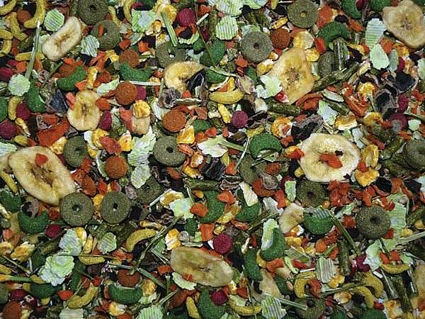 Složení: vojtěška, kukuřičné vločky, hrachové vločky, svatojánský chléb, extrudované obiloviny, mrkev, oves celý, kukuřice, banány, pšenice, mrkev.