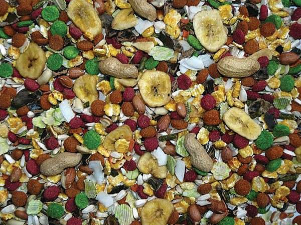 Výběrová krmná směs obohacená o spoustu oříšků, ovoce a zeleniny.