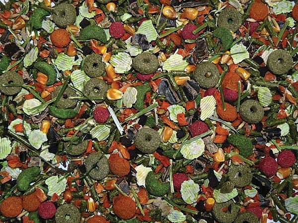 Složení: vojtěška, pšenice, extrudované obiloviny, kukuřičné vločky, mrkev, ječmen, rohovník obecný, kukuřice, hrachové vločky, červená řepa, petržel.