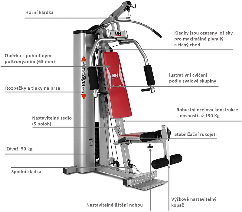 BH Fitness Multigym Plus patří mezi multifunkční posilovací zařízení určené pro každodenní silový trénink v domácím prostředí. Jedná se o značkovou posilovací věž, která nabízí řadu cviků pro procvičení horních i dolních partií těla. Věž má ocelovou konstrukci z trubkových profilů s dostatečnou sílou stěny a odolnou práškovou povrchovou úpravou s nosností až 100 kg. Možnost složení sedáku pro větší úsporu místa.
