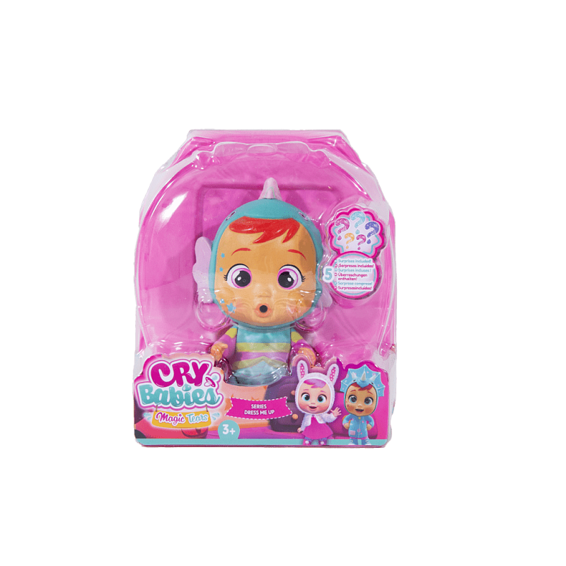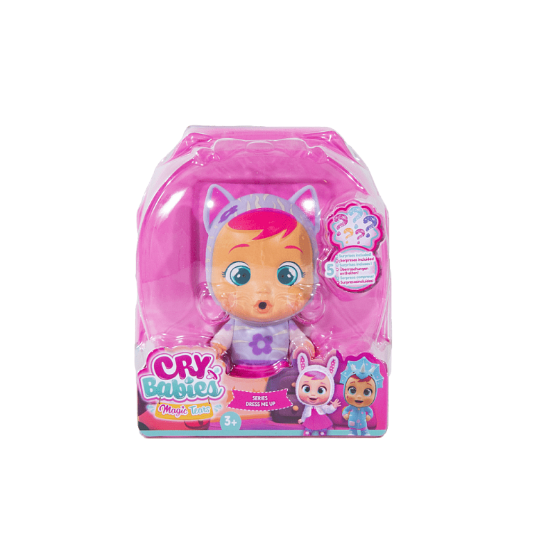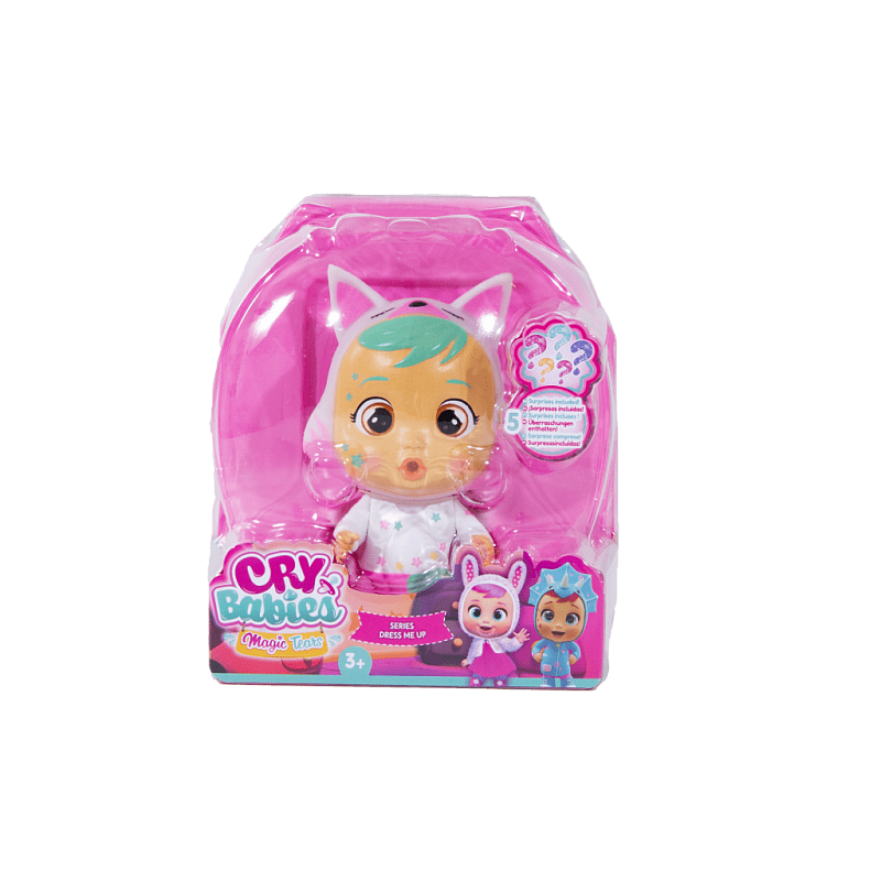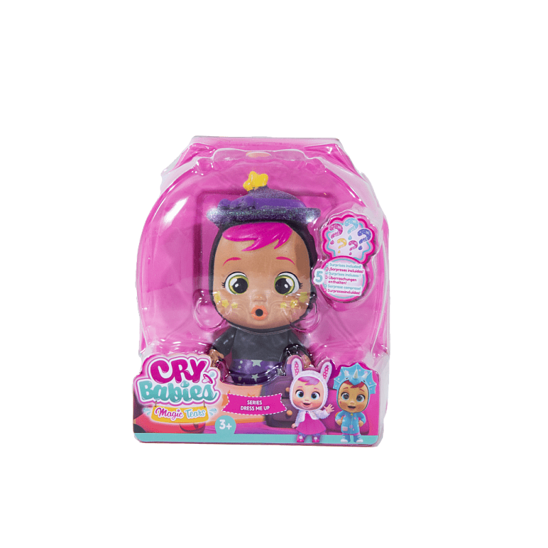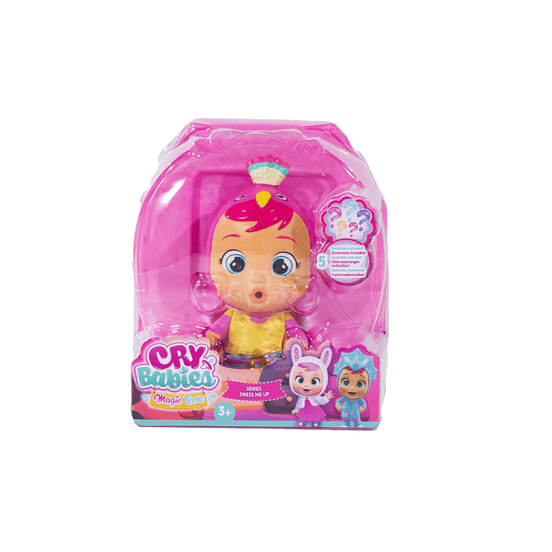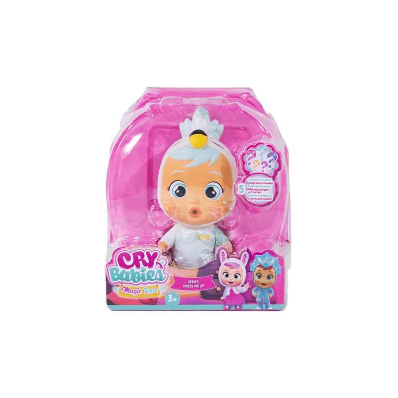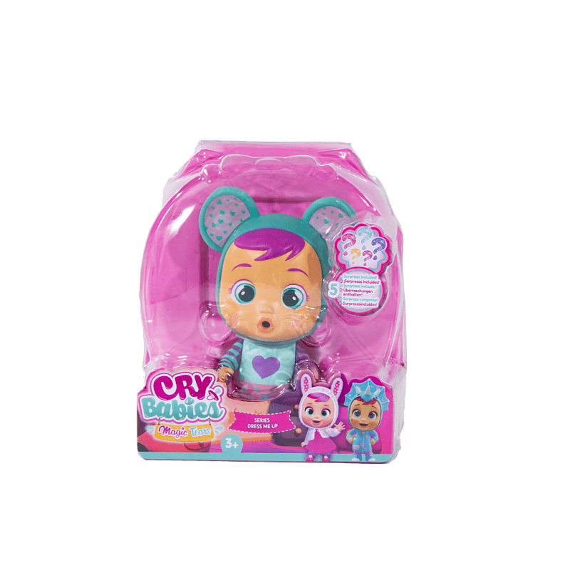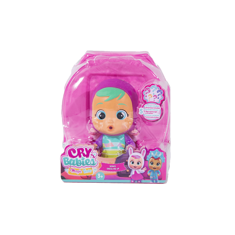 Cry Babies Magic Tears Dress Me Up mix sérií 1 a 2 v průhledném balení ti dovolí vybrat si panenku, kterou máš najradši. Na výběr máš až z 20 panenek a každá s sebou má 7 různých tematických doplňků. Panenku lze napojit vodou pomocí přibalené lahvičky. Když je panenka plná vody, po zmáčknutí bříška začně ronit slzy.
