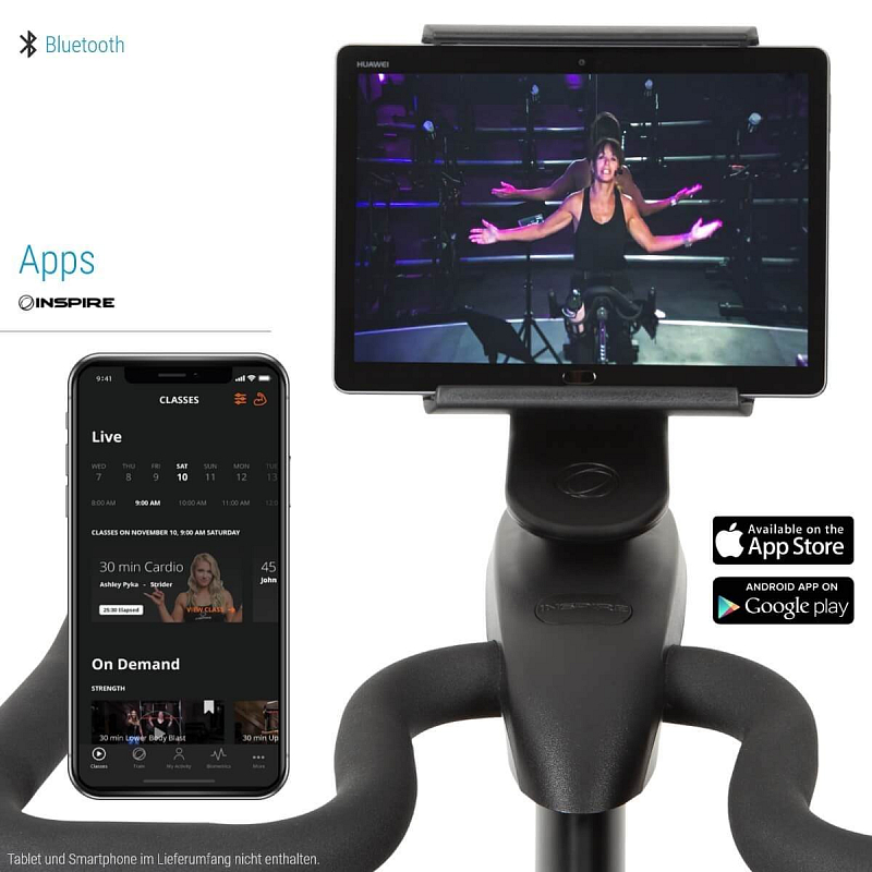 Aplikace Inspire Fitness přináší kurzy cyklistiky, které si můžete vychutnat z pohodlí vašeho domova. Aplikaci Inspire Fitness snadno a rychle nainstaujete do vašeho tabletu nebo smartphonu. Jednoduše naskenujte QR kód umístěný na držáku tabletu a postupujte podle pokynů na vašem mobilním zařízení. K dipozici je více než 150 různých workoutů a další denně přibývají! Aplikace vám na první pohled zobrazí všechna důležitá tréninková data a spojí vás s profesionálními trenéry, kteří vás motivují a povzbuzují v průběhu vašeho tréninku! Zažijte kurzy cyklistiky stejně jako v tělocvičně, přitom ale v pohodlí svého domova, kdykoli budete chtít.