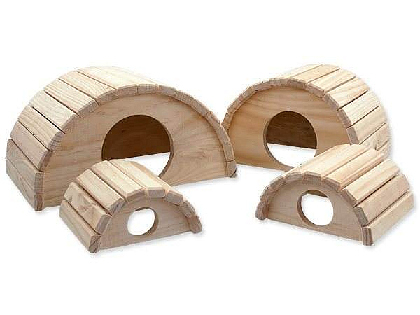 Dřevěný půlkruhový domek pro drobné hlodavce.