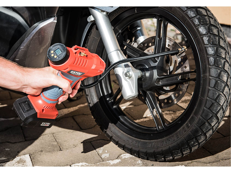 Výkonný a silný plnící aku kompresor, je určen ke kontrole a k doplnění tlaku pneumatik osobních a užitkových automobilů, motorek a cyklistických kol na předepsaný tlak a s dodávaným příslušenstvím také k nafouknutí sportovních míčů, lehátek, matrací apod. Na displeji kompresoru si můžete jednoduše zvolit tlak v bar, psi, kPa a kompresor se automaticky při dosažení této hodnoty zastaví. Pro práci ve tmě je tento displej podsvícený a kompresor má světlo, které svítí i když kompresor není zapnutý. Spínač kompresoru je vybaven pojistkou proti samovolnému spuštění a zámkem, kterým můžete zaaretovat spínač v poloze zapnuto. Samotný kompresor uvnitř stroje má celokovovou konstrukci zajišťující dlouhou životnost. Pro běžnou práci dostačují jeden nebo dva 2000mAh akumulátory, které můžete rychle nabít v rychlonabíječce, pro náročnější nebo delší práci doporučujeme větší akumulátory s kapacitou 4000–8000mAh. Akumulátor má indikátor nabití a lze použít ve všech typech nářadí řady EXTOL SHARE20V. Díky použité Li-ion technologii je ho možné kdykoliv dobíjet, aniž by se tím snižovala jeho kapacita. Li-ion akumulátor ztrácí energii vlivem samovybíjení velmi pomalu a vydrží dlouho nabitý a připravený k použití.