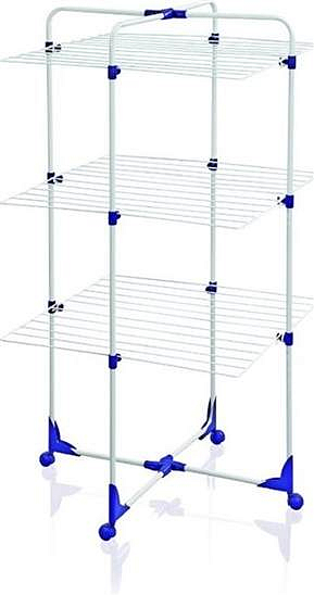 sušící plocha 27 m, možnost umístění do sprchového koutu, 3 patra,klip pro zavěšení dalších 6 ramínek, pro 3 pračky prádla, se 4 integrovanými kolečky pohyblivými do 360°,bílá, modrá