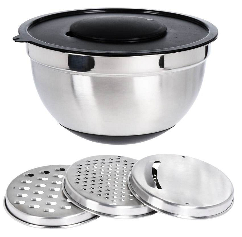 - multifunkční nerezová mísa se třemi struhadly- mísa je vyrobena z nerezavějící oceli a víko je silikonové- mixovací mísa a struhadlo v jednom- díky částečnému otvoru v silikonovém víku můžete mixovat a šlehat bez stříkání- celé víko je samozřejmě plně odnímatelné- při nasazení výměnného struhadla můžete strouhat potraviny přímo do misky- spodní základna mísy má silikonovou úpravu, díky tomu je protiskluzová- šetří Vaši kuchyni od zbytečného nepořádku a uspoří také místo v kuchyni- sada obsahuje 3 různé nástavce na strouhání:- Jemné struhadlo- Hrubé struhadlo- Struhadlo na plátky- rozměry: 25,5 x 14 cm