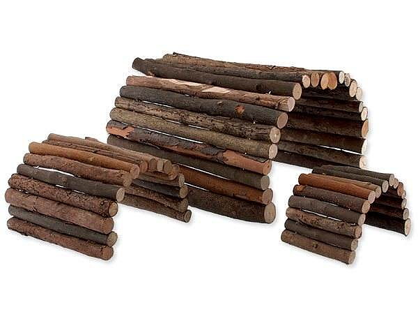 Dílky dřeva jsou spojeny dráty a tím lze snadno vytvarovat požadovaný tvar domku či úkrytu.