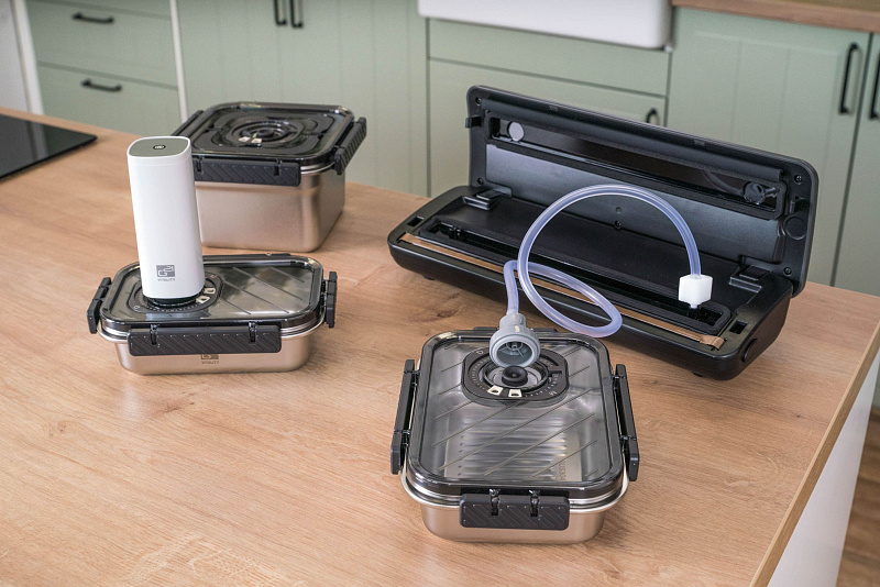 Vakuovačka G21 Nefrit odsává vzduch nejen z vakuovacích sáčků nebo fólií v rolkách, ale i z vakuovacích marinovacích dóz. Stačí napojit hadičku na příslušný otvor vakuovací dózy G21 (hadička je součástí balení dózy) o objemu 1,4 nebo 2 l, zmáčknout příslušné ovládací tlačítko a potraviny v dóze budou spolehlivě zavakuované.