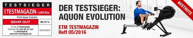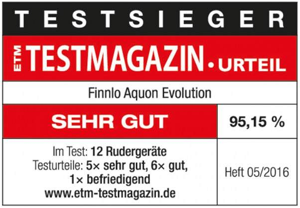 Veslovací trenažér FINNLO Aquon Evolution získal hodnocení "VELMI DOBRÝ" (95,1 %) v testu veslovacích trenažérů německým časopisem Testmagazin.