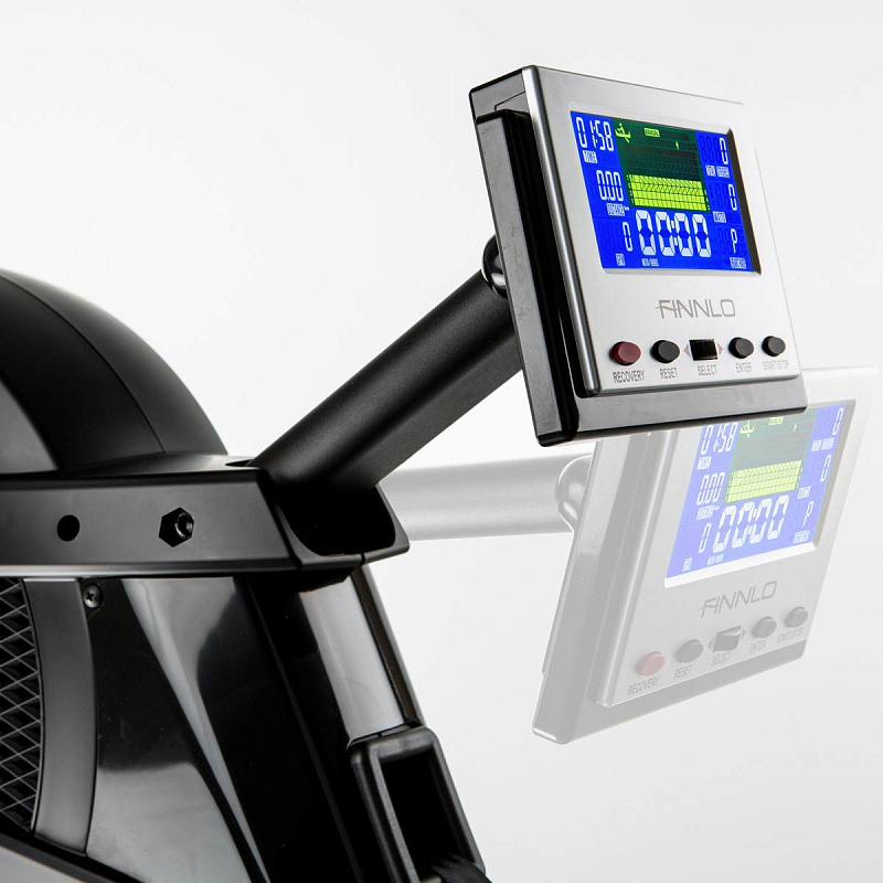 FINNLO Aquon Evolution má přehledný LCD displej s modrým podsvícením, který lze dle potřeb naklánět. Tréninkový počítač nabízí 8 trvale zobrazených hodnot. Měřené údaje jsou: čas, kalorická spotřeba, tepová frekvence, vzdálenost, počet záběrů, záběry/min., čas na ujetí 500 m, watty, nastavení horní hranice tepové frekvence. Ta se měří prostřednictvím hrudního pásu s přesností EKG. Hrudní pás není součástí dodávky, ale je možné jej u nás dokoupit.